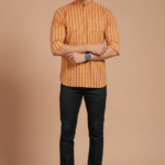The Perfect Blend of Heritage and Modernity. Upgrade your casual wardrobe with our Amber Horizon Mandarin Shirt. Featuring a vibrant ochre and saffron vertical stripe pattern, this short kurta offers a tailored fit with a classic mandarin collar and short sleeves. Crafted from breathable, lightweight fabric, it’s designed to keep you cool and sharp for any summer occasion.